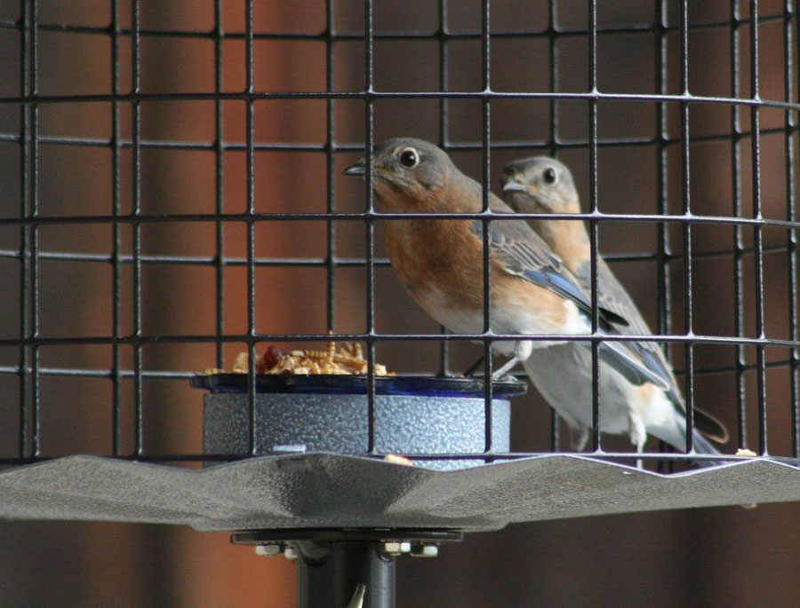 Having observed these feeding behaviors and able to distinguish the mated pair from the season's offspring even after the first brood youngsters began to molt and lose their juvenile spots, I have assumed that the bluebirds now visiting the mealworm feeder are the nest box pair and their offspring. Since the family left the immediate area after the second brood fledged, I have naturally assumed that the birds having difficulty entering the feeder through the guard are the second brood juveniles that had no opportunity to practice.
